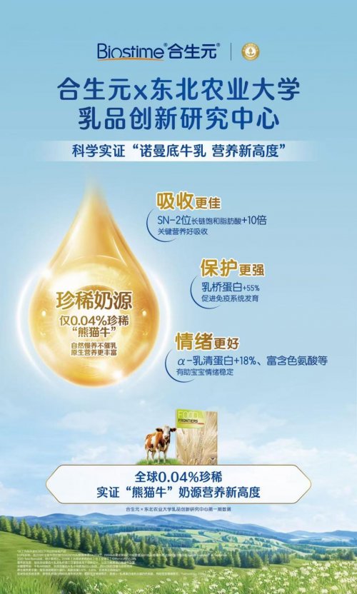 在活动展台上,合生元最新的奶源研究成果还引发了参展嘉宾的广泛关注。为深挖“熊猫牛”奶源的营养价值,合生元携手东北农业大学成立“乳品创新研究中心”,以科研协同夯实品质基础。近期,“乳品创新研究中心”首个诺曼底牛乳源研究成果在国际权威食品前沿杂志《FoodFrontiers》重磅刊登。该研究显示:“熊猫牛”奶源SN-2位脂肪含量高,SN-2位长链饱和脂肪酸相比荷斯坦牛�倍,更接近母乳脂肪构成,更丰富的保护力成分如乳桥蛋白+55%,以及更多乳源活性成分如α-乳清蛋白,色氨酸等,这些成分与宝宝的免疫提升、情绪稳定有关。“熊猫牛”奶源研究成果科学展示了诺曼底“熊猫牛”奶源的营养优势,不仅驱动着合生元持续提升奶粉产品品质,也为行业树立了奶源品质的标杆并推动行业迈向“品质升级”的新征程。